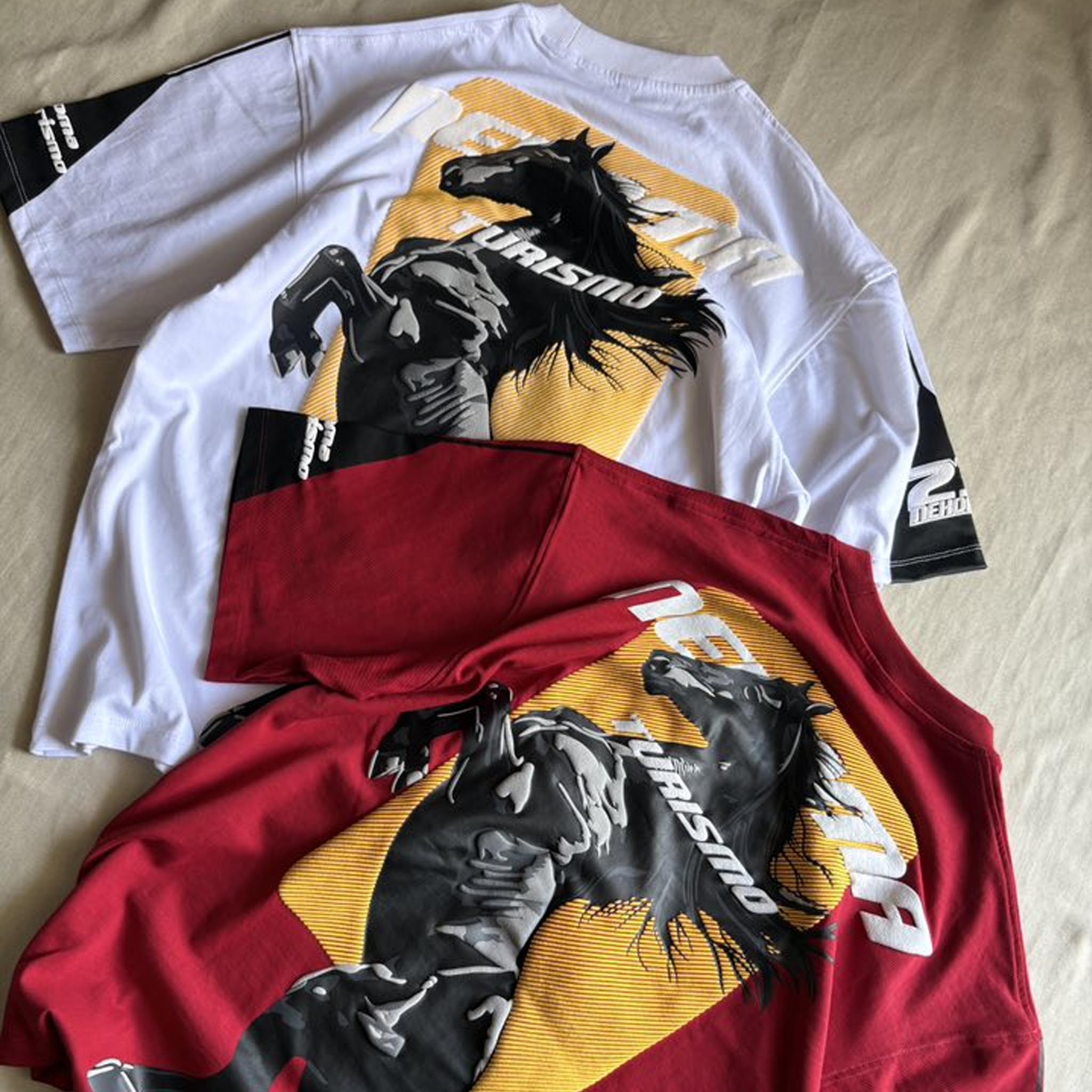 Featuring a dynamic stallion design brought to life with puff, rubber, and pigment print for a premium textured finish.