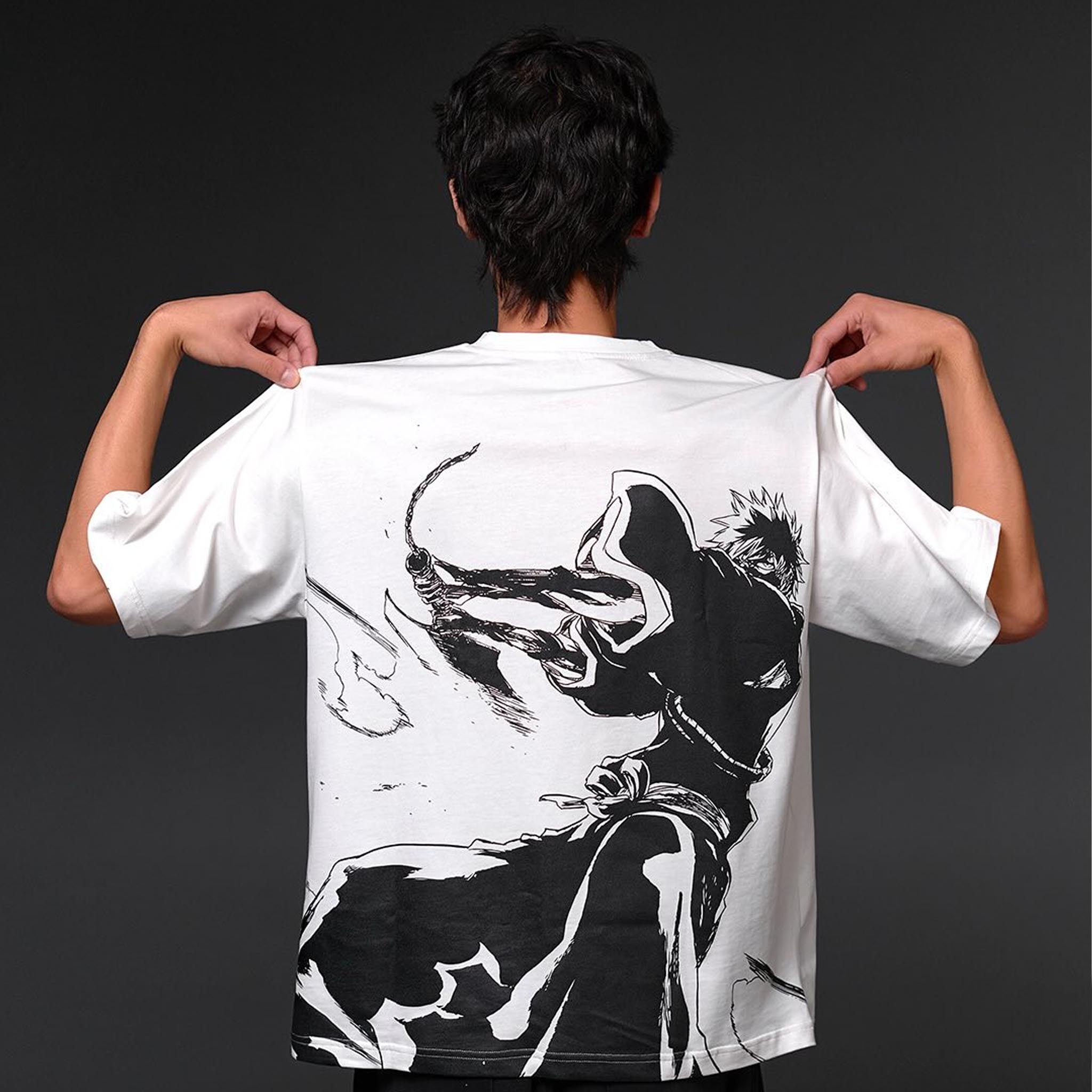Step into the battlefield with Ichigo Kurosaki, the soul reaper who carries the weight of two worlds. This oversized tee features a dynamic back print of Ichigo mid-strike — capturing his fierce determination and unstoppable will. Built for warriors at heart, this piece is your statement of strength.